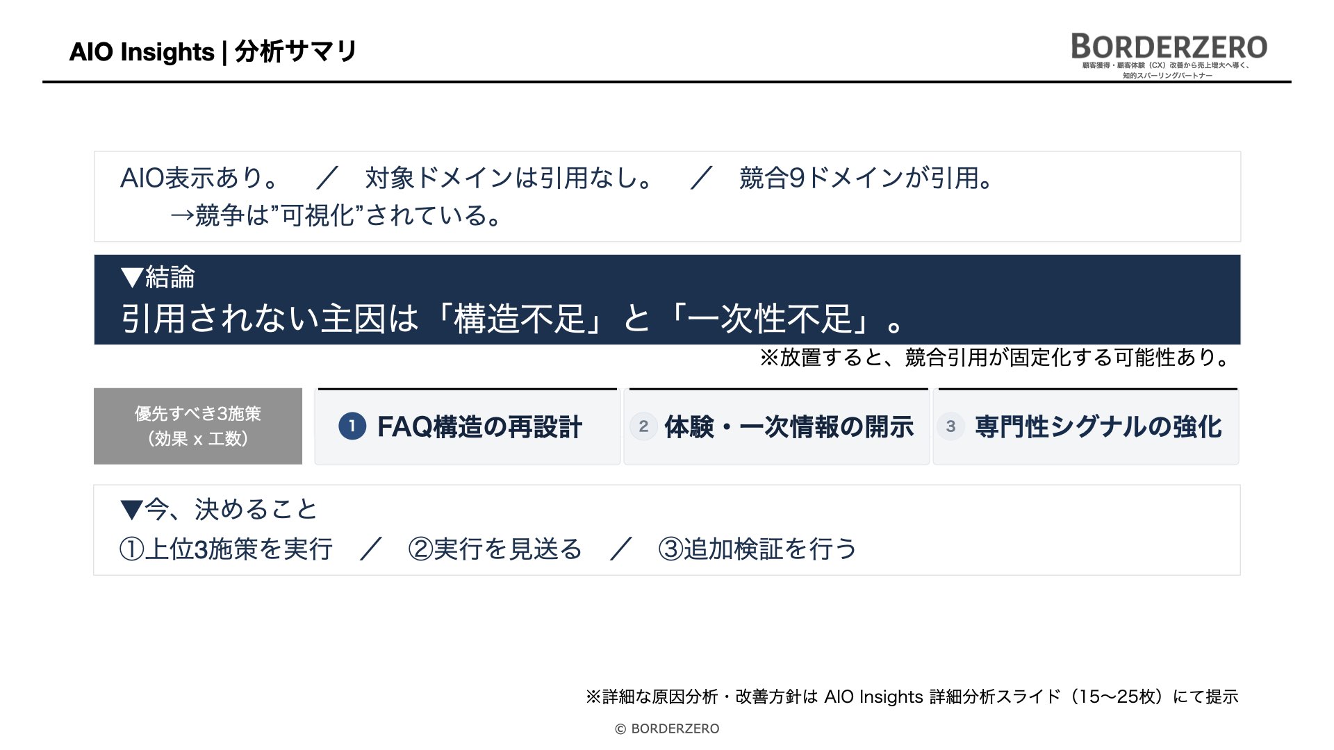 AIO Insightsでは、単なる分析ではなく、「戦うかどうか」と「何をやるか」を決めるための構成で整理します。