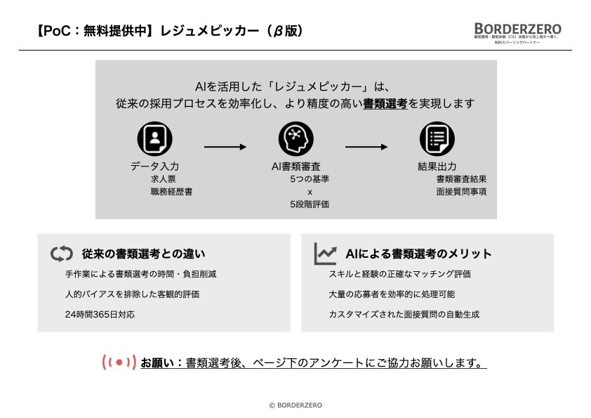 - 本サービスの出力結果の正確性や完全性は保証いたしかねます。最終的な判断・選考は必ずご自身の責任で行ってください。